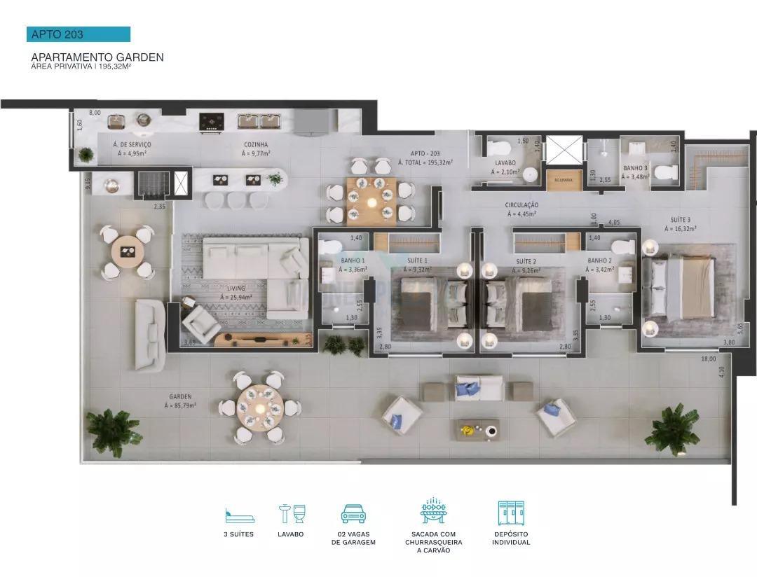 Este imóvel também se destaca pela sustentabilidade e tecnologia avançada. Com tomadas de carregamento para automóveis elétricos nas garagens revestidas com cerâmica e sistema de aproveitamento da água da chuva para limpeza das áreas comuns. As esquadrias possuem persianas automatizadas nos quartos, garantindo praticidade na hora do descanso. Para completar, cada apartamento possui depósito individual e churrasqueira a carvão equipada com exaustor elétrico — ideal para reunir amigos e familiares em momentos inesquecíveis. Venha conhecer este incrível empreendimento que redefine o conceito de morar bem!