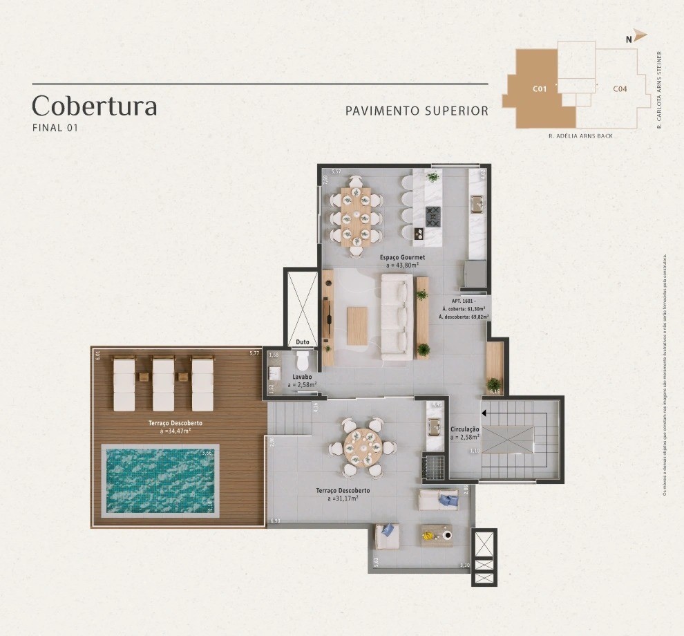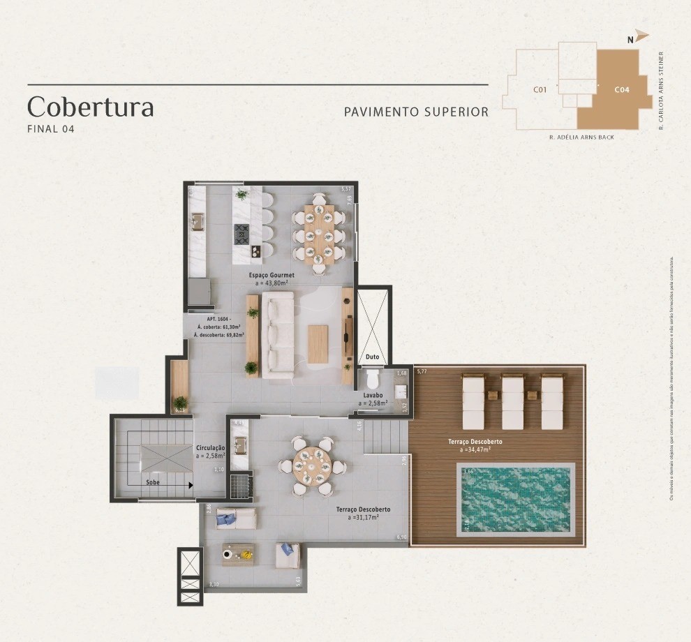 • Coberturas com área privativa ampliada, piscina e churrasqueira