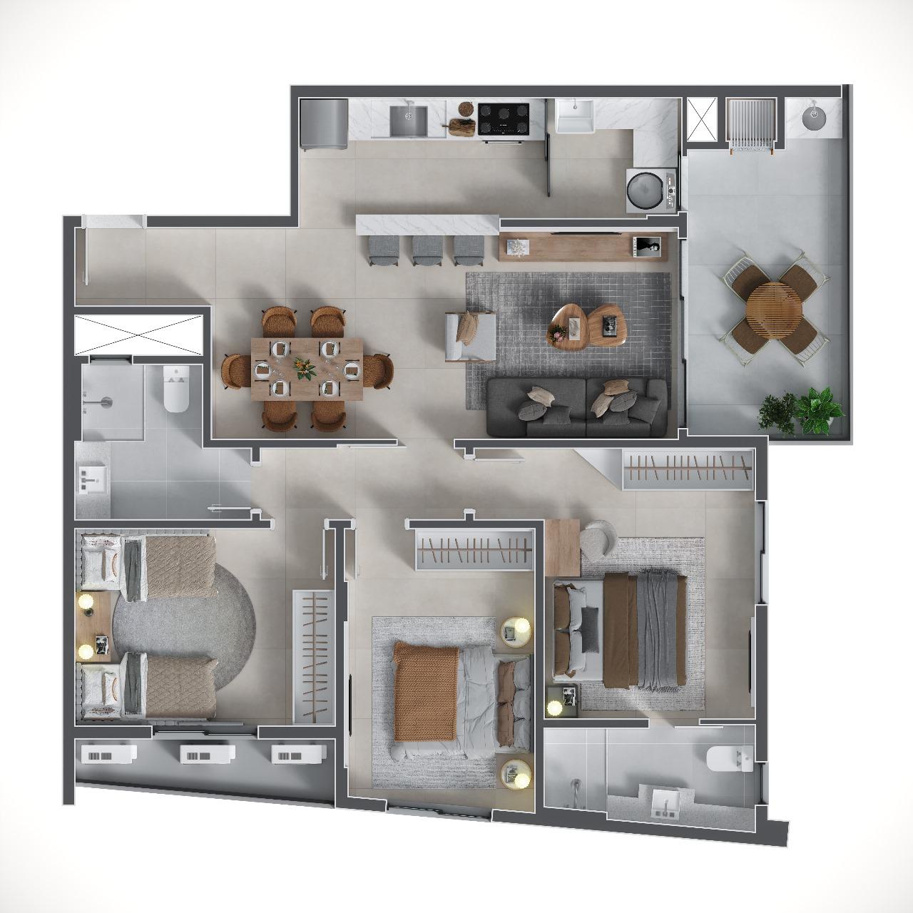 🏢 Apartamentos com 3 dormitórios, sendo 1 suíte, e espaços que chegam a até 103m². Cada unidade vem equipada com fechadura digital, churrasqueira a carvão e tubulação para água quente. As áreas comuns incluem piscina com prainha, salão de festas, espaço fitness e playground para diversão de todos.