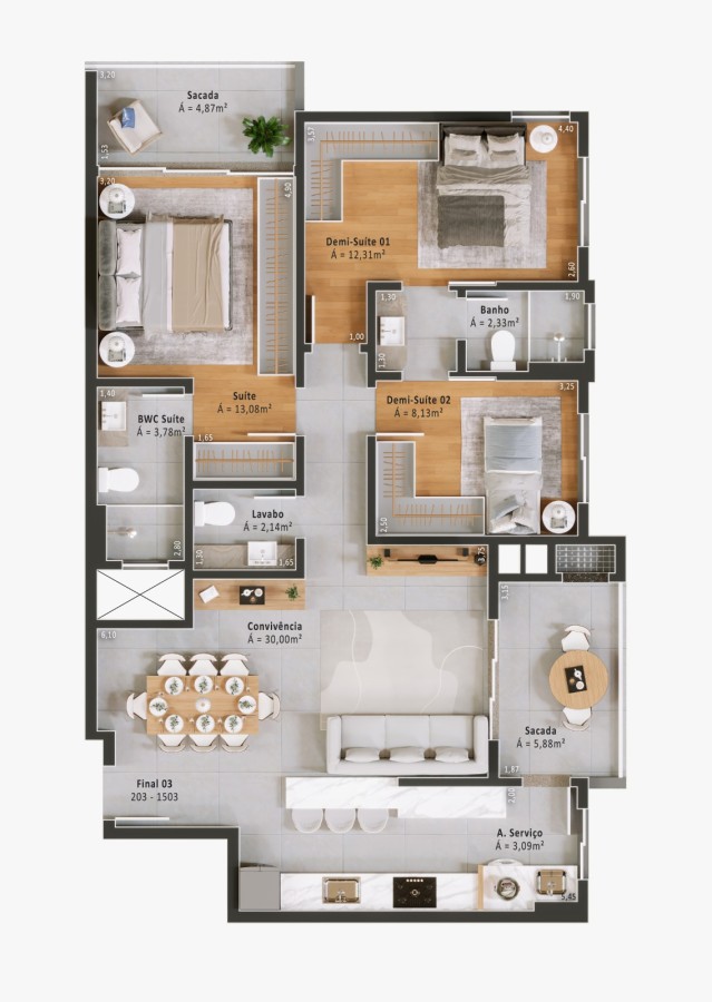 🌟 Unidade 201 – 3 dormitórios, 145,97 m² totais
